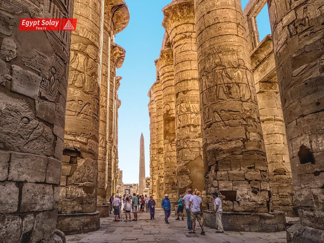In the morning you will check out and you will be transferred to Cairo airport to fly to Luxor. Upon arrival to Luxor airport, you will be met and assisted by Egypt Solay Tours Representative, who will transfer you to your Nile River cruise. Enjoy your lunch on board, after that you will start your tour by visiting Karnak Temple the greatest example of worship in the history, dedicated to the God Amon, his wife Mut and their son Khonsu. Then the second temple on the east bank on the Nile River is Luxor temple which was constructed approximately 1400 BC. It contains the Avenue of Sphinxes visit the Unfinished Propylon, the Hypostyle Hall with its 134 gigantic columns, the Obelisks of Queen Hatshepsut and Tutomosis III. Dinner on board & Belly Dancing show. Overnight on Board in Luxor.