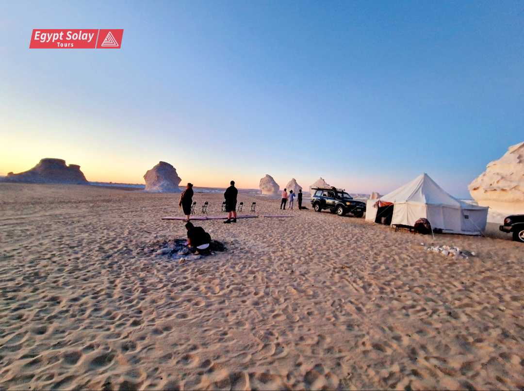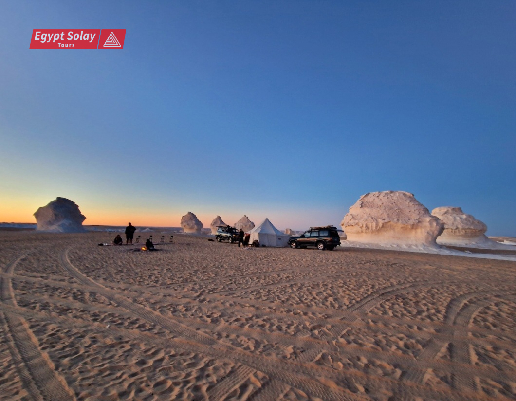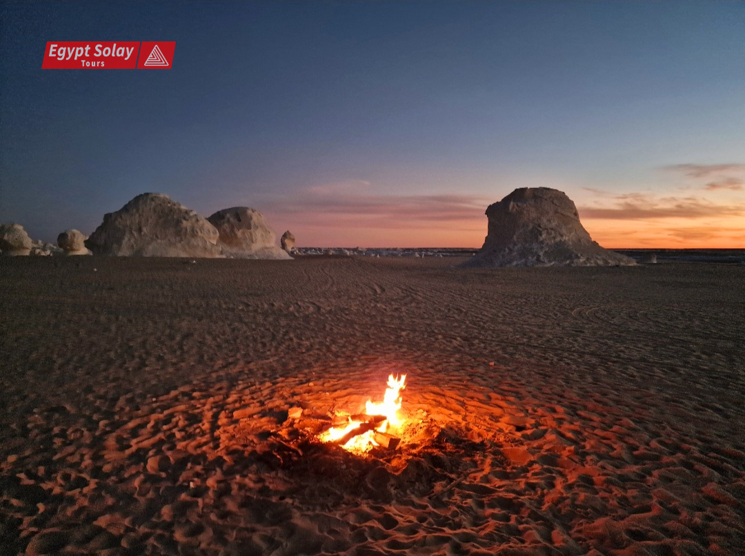Our Egypt Solay Tours driver will pick you up from your hotel in Cairo or Giza in early morning at 07:00 am and transfer you to Bahariya Oasis about 350 km east of Cairo this journey takes roughly 4 hours. We will stop in the middle of the way at a rest house for a little bit to get refreshed. Lunch will be served at a local restaurant at Bahariya oasis. Upon arrival at around 11:30 you will change the vehicle by 4× 4 safari vehicle and meet our local Bedouin guide who will guide you to the main attractions of the desert starting with the Sand Dunes area where you will stop to take some pictures above one of the Dunes which its height up to 50 meters. Then proceeding to see the quartz crystal at Crystal Mountain, and the rocky formations in the Valley of Agabat which consists of limestone hills and magnificent sculptures, its name means obstacles. Continue driving to the White Desert National Park the most well-known desert destination in Egypt. The quantity of unearthly and beautiful wind-carved rock formations shaped in the form of giant mushrooms or pebbles is unequalled in any desert in the world. Also, you will find the tracks of the desert foxes on the sand which are living around this area. Overnight Camping at the White Desert While the Bedouins prepare the Barbeque dinner, you will sit on an open-air pavilion around a fire circle watching a wonderful view of the sky, which is full of stars.